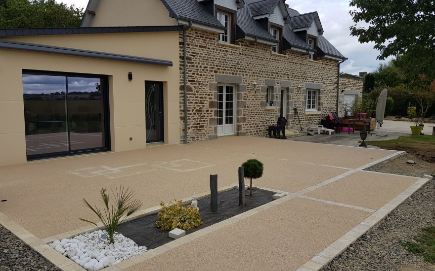 Très prisée dès que la belle saison démarre, une terrasse, à l'égal de celle montrée ici à La Graverie en gravier aggloméré, est l'aire de détente parfaite ! En effet elle vous permet de vous réunir entre amis ou avec votre famille afin de de profiter de jolis moments. Aménager par le nécessaire pour le repas, vous pourrez profiter dès que la température le permet, comme il se doit. Afin de pouvoir en profiter sans contraintes, le choix du bon revêtement est primordial. Il doit être robuste, drainant et facile d'entretien. Mais aussi, vous pourrez décorer votre terrasse afin de lui donner du style, en adéquation avec votre décoration.