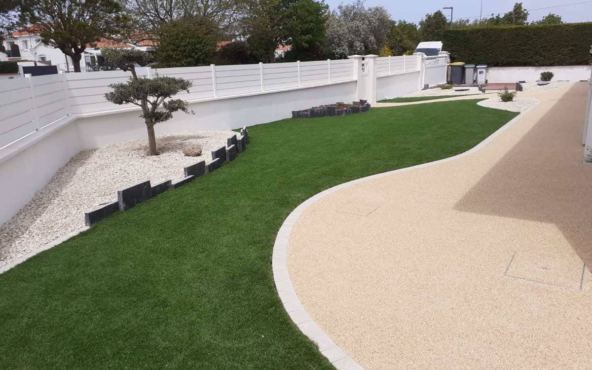 10374En pierre, asphalte ou avec des éléments décoratifs, l'allée piétonne, comme celle exposée ici en pavé pour bordure et terrasse, gazon synthétique et gravier aggloméré à Notre dame de monts, est le chemin qui favorise l'entrée de la maison. L'allée piétonne est communément longée de pavés dans le but de borner mais aussi d'agencer les espaces de pelouse ou massifs fleuris.