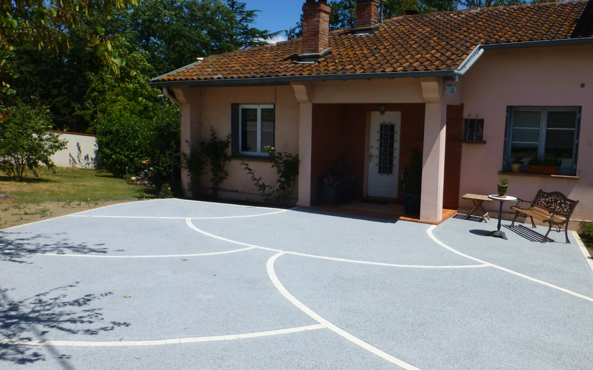 Les cours, comme celle-ci présentée à Frouzins en béton désactivé ont un grand nombre de fonctions, elles peuvent servir d'endroit ludique, de zone pour garer vos voitures, de voie de déplacement... Pour penser ou borner ces espaces, quelques solutions sont possibles : un grand nombre de moyens selon l'utilité, le même revêtement de différentes couleurs, mais aussi des bordures de pavés.